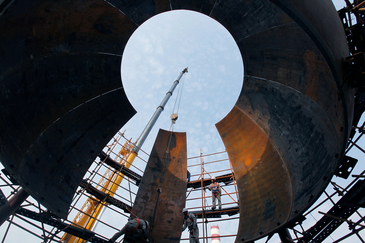 作品說明:球(qiu)罐是化工企業(ye)的(de)常見(jian)存儲設備,作為壓(ya)力容器,對(dui)材質和建(jian)造(zao)(zao)質量的(de)要求都(dou)很高,建(jian)造(zao)(zao)難度也較(jiao)大,在建(jian)造(zao)(zao)工人巧(qiao)手的(de)“縫制”下,一(yi)臺臺球(qiu)罐逐漸成型(xing)。