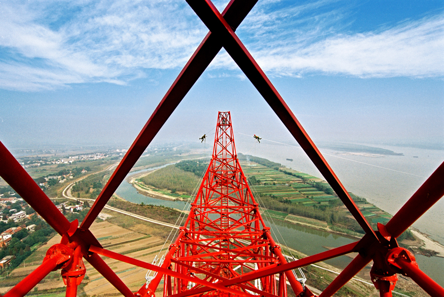 作品說明:2007年8月17日(ri),在湖北(bei)(bei)黃石市長江(jiang)(jiang)邊(bian),國網(wang)湖北(bei)(bei)送(song)變電工(gong)程有(you)限公司施工(gong)人員(yuan)在201米(mi)跨(kua)江(jiang)(jiang)輸電高塔上,安裝地(di)線(xian)防震錘等(deng)附(fu)件。500千伏黃石至(zhi)黃岡(gang)輸電線(xian)路是(shi)湖北(bei)(bei)環網(wang)重點工(gong)程,為(wei)湖北(bei)(bei)經(jing)濟(ji)發(fa)展提供(gong)可靠能源保(bao)障。該線(xian)路跨(kua)越長江(jiang)(jiang),經(jing)過(guo)800多名施工(gong)人員(yuan)一年多建設,全線(xian)貫通。