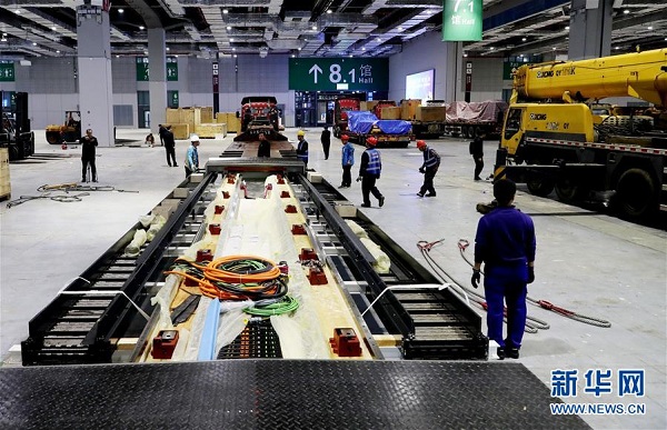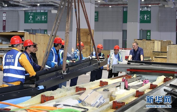 工人們在國家會展中心(上海)7號館內將從集裝箱中拆出的“金牛座”龍門銑床的零部件進行組裝
