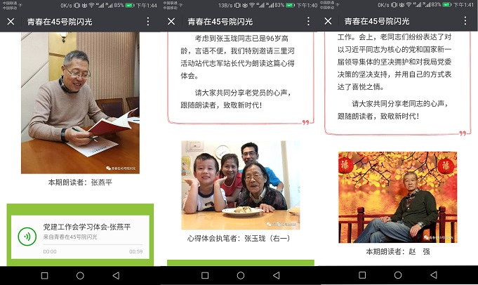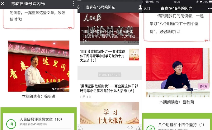 在局(ju)(ju)黨委的(de)關心指導和大(da)力支(zhi)持下,局(ju)(ju)青(qing)年小組集思廣益、開拓(tuo)思路(lu),拿出了新(xin)的(de)活動方案:一是(shi)開設微(wei)信公眾號(hao)“青(qing)春在45號(hao)院閃光”,利(li)用這一新(xin)媒(mei)體平臺發(fa)(fa)送學習(xi)(xi)(xi)內容(rong),直接面向有學習(xi)(xi)(xi)能(neng)力和學習(xi)(xi)(xi)熱情的(de)老同(tong)志;二是(shi)開展“用朗讀(du)致敬(jing)新(xin)時(shi)代”系列活動,通過朗讀(du)學習(xi)(xi)(xi)材料、錄音(yin)并(bing)發(fa)(fa)送,為老同(tong)志們(men)(men)提供更適合他們(men)(men)的(de)學習(xi)(xi)(xi)形(xing)式和學習(xi)(xi)(xi)內容(rong)。