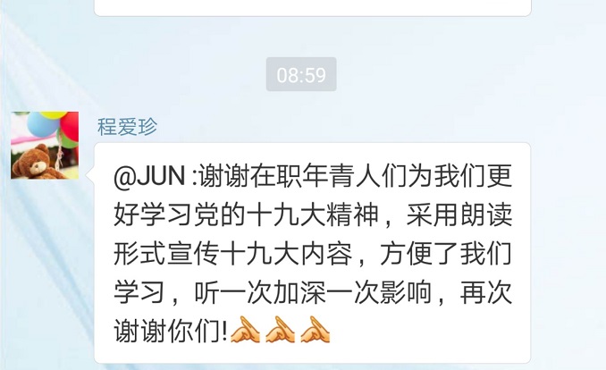 “用朗讀致敬新時代”的首季活動,便是全文朗讀黨的十九大報告,以這種方式帶領全局廣大黨員和離退休干部學習黨的十九大精神。根據報告的內容結構,我們將報告分成若干部分,每個部分由一位同志進行朗讀,大家接力朗讀,完成學習內容。朗讀的語音和文字內容在微信公眾號上發布,再分享到我局在職人員和老同志的微信群、朋友圈中,確保大多數人都能收到、能聽到。