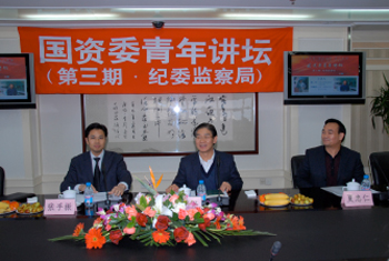 2007年12月7日,國資委第三期青年講壇在紀委監察局舉辦,紀委監察局政策研究室陳珂同志和三室劉嗣永同志分別作了題為《關于企業紀檢監察工作的理性思考》和《案件檢查與機關青年干部成長》的講演。駐委監察局副局長夏忠仁(正局級)做了精彩點評。國資委黨委委員、紀委書記賈福興出席講壇并發表了熱情洋溢的講話。本期講壇由直屬機關團委書記、委青年理論學習研究會秘書長張乎振主持。駐委監察局副局長阮國平,國資委青年理論學習研究會理事會成員、秘書處成員,直屬機關團干部,紀委監察局、監事會的青年同志及委內自愿參加同志共50多人參加了活動。