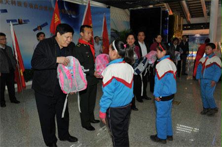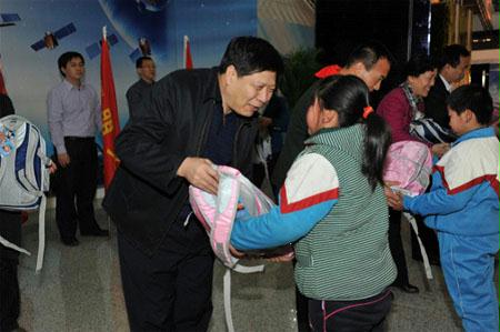 在(zai)航天(tian)(tian)城(cheng)會展(zhan)中(zhong)心展(zhan)廳,孩(hai)(hai)子(zi)(zi)們(men)第一次見(jian)到了從前(qian)只有(you)在(zai)電視上才能見(jian)到的(de)(de)英雄(xiong)航天(tian)(tian)員(yuan)(yuan)費俊龍,當費將軍走進展(zhan)廳的(de)(de)時候,孩(hai)(hai)子(zi)(zi)們(men)歡呼著,跳躍著,激動的(de)(de)心情寫在(zai)了紅(hong)撲撲的(de)(de)小臉上,為(wei)英雄(xiong)航天(tian)(tian)員(yuan)(yuan)獻(xian)上手中(zhong)的(de)(de)紅(hong)領(ling)巾和(he)鮮花,獻(xian)上一個個莊嚴的(de)(de)少先(xian)隊(dui)隊(dui)禮,來(lai)表(biao)達他們(men)對航天(tian)(tian)員(yuan)(yuan)叔叔崇高的(de)(de)敬意和(he)無(wu)限(xian)的(de)(de)敬仰(yang)之情。費將軍親切的(de)(de)和(he)孩(hai)(hai)子(zi)(zi)們(men)一一握(wo)手、問好,并(bing)鼓(gu)勵孩(hai)(hai)子(zi)(zi)們(men)要熱愛(ai)黨(dang)、熱愛(ai)人民(min)、熱愛(ai)偉大(da)的(de)(de)祖國(guo),要勇敢、堅強,不怕困難,超越自我。珍惜現在(zai)的(de)(de)學(xue)(xue)習條件和(he)所有(you)人的(de)(de)關(guan)(guan)心幫助(zhu),努力(li)學(xue)(xue)習,真正成為(wei)中(zhong)國(guo)特(te)色社會主義事業的(de)(de)合(he)格建(jian)設(she)者(zhe)和(he)可靠接班人!他在(zai)講話中(zhong)表(biao)示通過這次活動能夠為(wei)孩(hai)(hai)子(zi)(zi)們(men)獻(xian)愛(ai)心,積極履行社會責任,非常有(you)意義。費將軍還(huan)和(he)國(guo)資委(wei)直屬(shu)機關(guan)(guan)黨(dang)委(wei)常務副書(shu)記(ji)曾堅、企(qi)業改革局局長白(bai)英姿、直屬(shu)機關(guan)(guan)工會主席(xi)呂秋菊(ju),以及(ji)中(zhong)國(guo)航天(tian)(tian)科技集團公司五院黨(dang)委(wei)書(shu)記(ji)李開民(min)一起(qi),把嶄新的(de)(de)學(xue)(xue)習用(yong)品送到了孩(hai)(hai)子(zi)(zi)們(men)手中(zhong)。