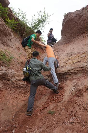 野外科考經常在荒無人煙的地方,交通不便。在危險陡峭的峽谷隘口,科考隊王強博士發出了“踩著我的腳,上”這樣的最強音。
