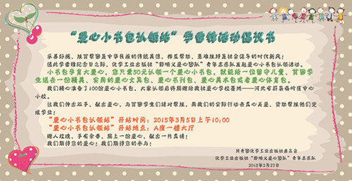 2015年(nian)3月5日,值(zhi)學雷(lei)鋒紀念日之際,石化聯(lian)合會所(suo)屬化學工業出版社團(tuan)委聯(lian)合“郭明義愛心(xin)團(tuan)隊(dui)”青年(nian)志愿隊(dui)發起“愛心(xin)小(xiao)書(shu)包認領站(zhan)”活(huo)動。